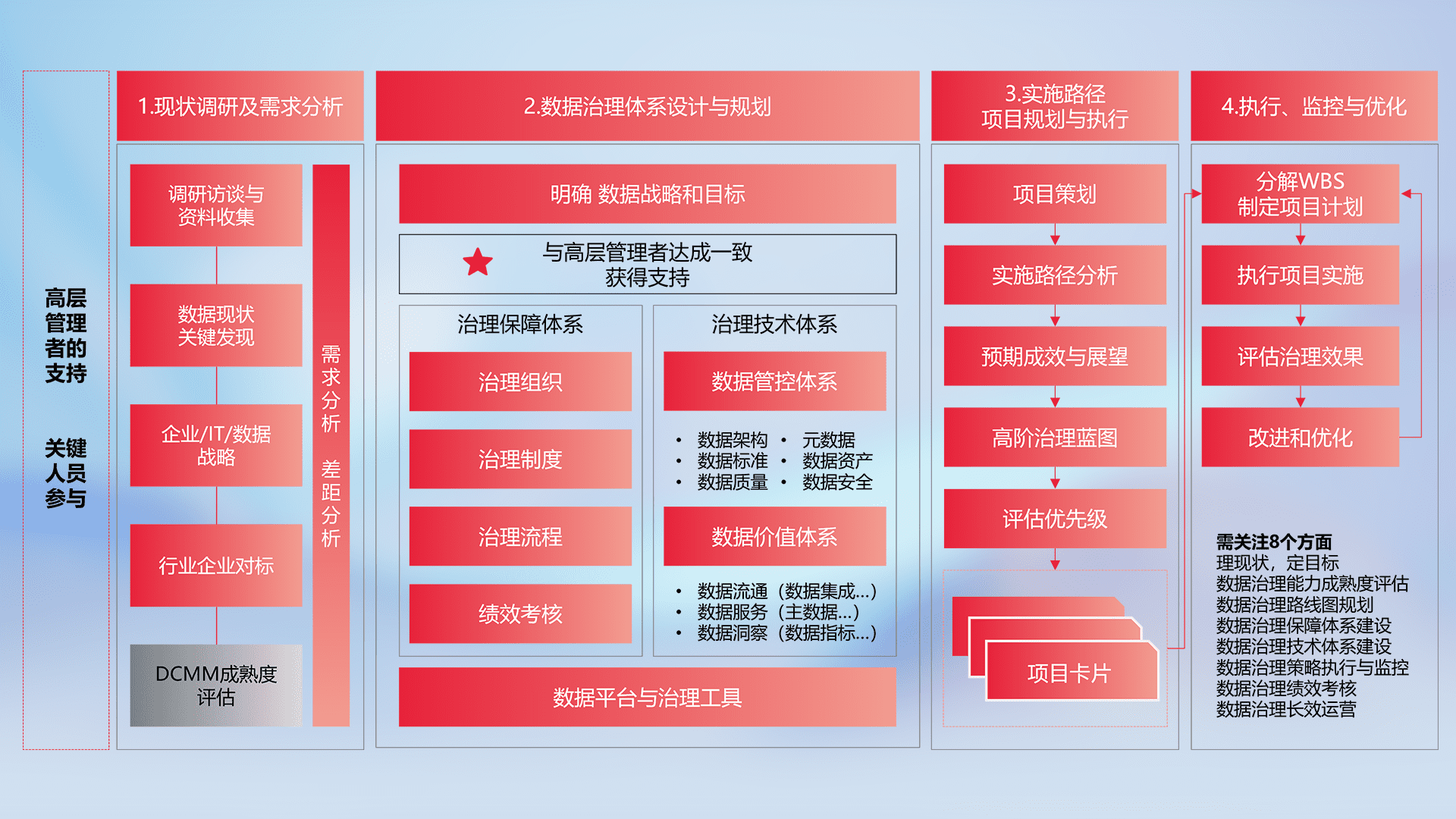 制定并执行统一的数据标准,,,,规范数据定义和格式,,消除冗余和不一致性,,实现跨部门和跨系统的数据一致性,,,为企业提供标准化的数据基础。。